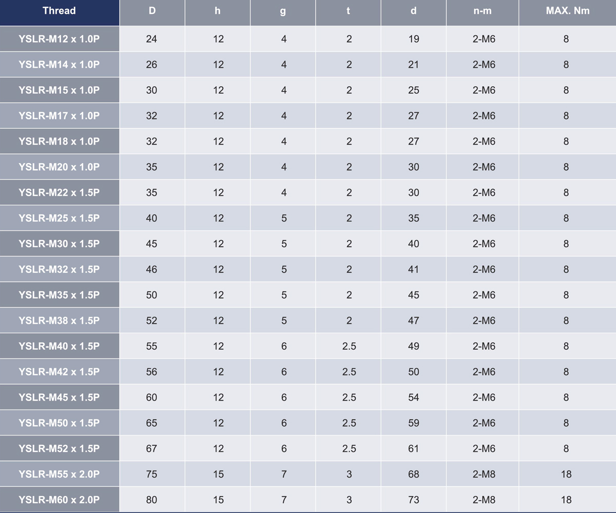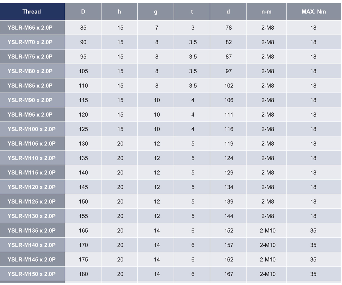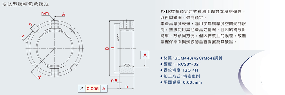 YSLR螺帽锁定方式为利用钢材本身的弹性,以径向锁固,强制锁定。 本产品厚度较薄,适用于螺帽厚度空间受到限制,无法使用其他产品之情况,且因结构设计简单,故锁固方便,但因安装上的误差,故无法确保平面与螺纹的垂直偏摆为其缺点。