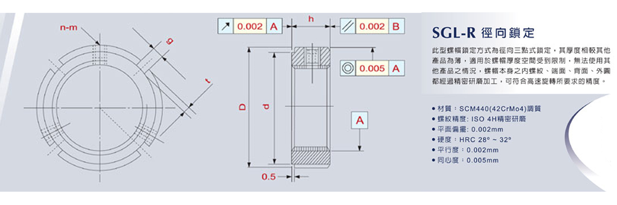 此型螺帽锁定方式为径向三点式锁定,其厚度相较其他产品为薄,适用于螺帽厚度空间受到限制,无法使用其他产品之情况,螺帽本身之内螺纹、端面、背面、外圆都经过精密研磨加工,可符合高速旋转所要求的精度。