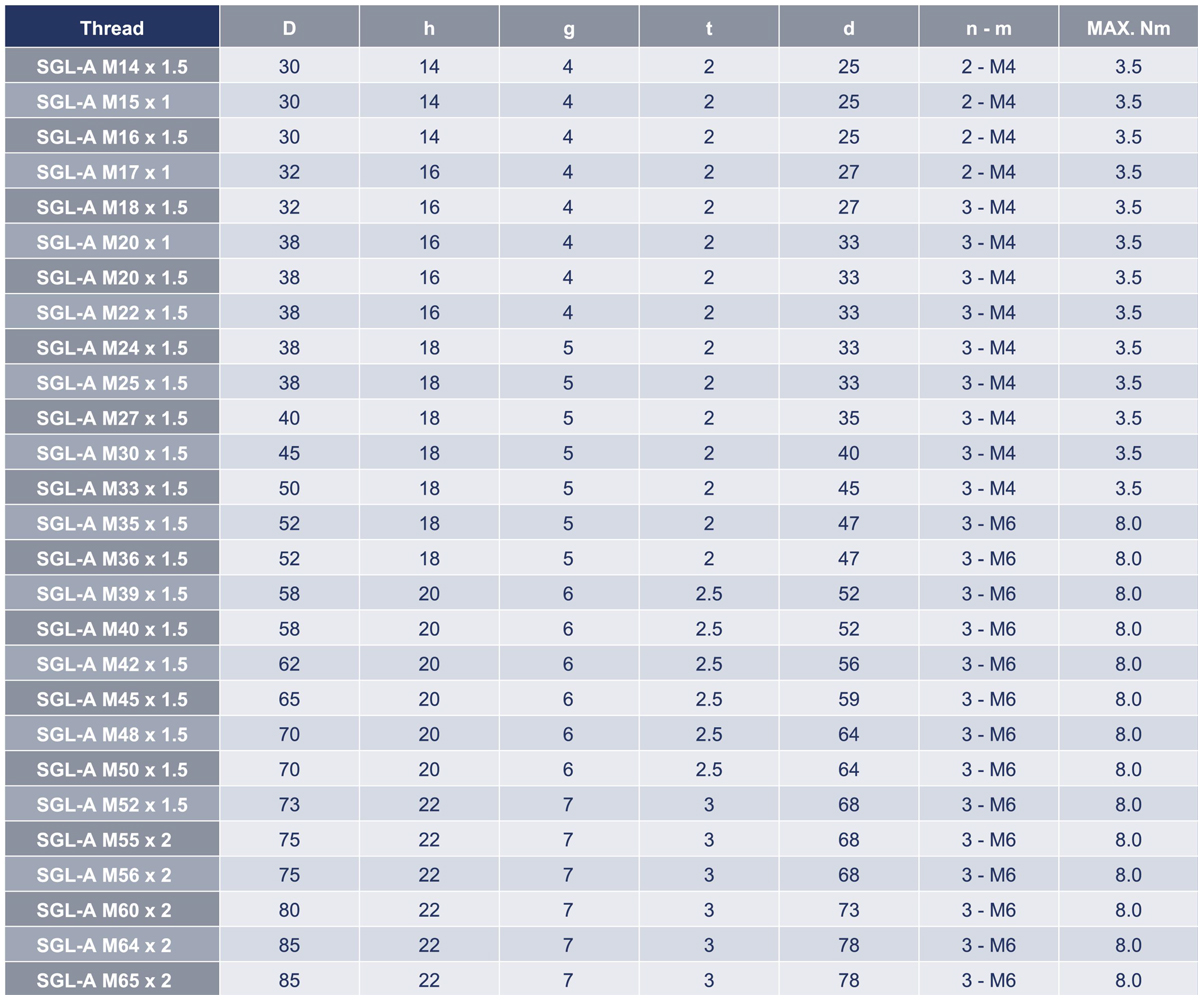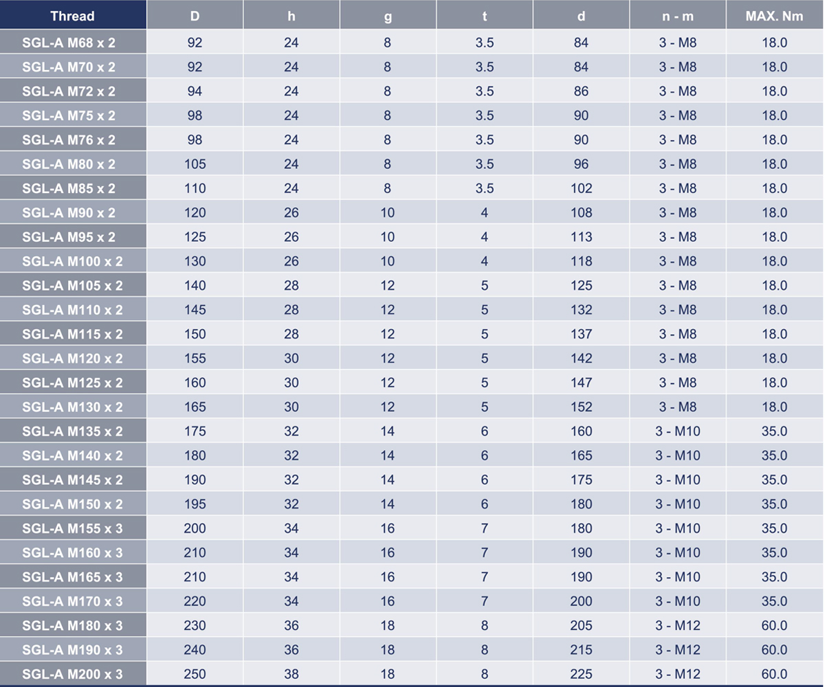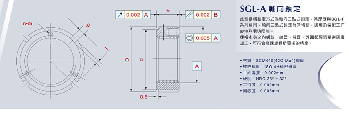 此型螺帽锁定方式为轴向三点式锁定,其厚度与SGL-F系列相同,轴向三点式锁定为其特点,适用于装配工作的特殊环境限制。