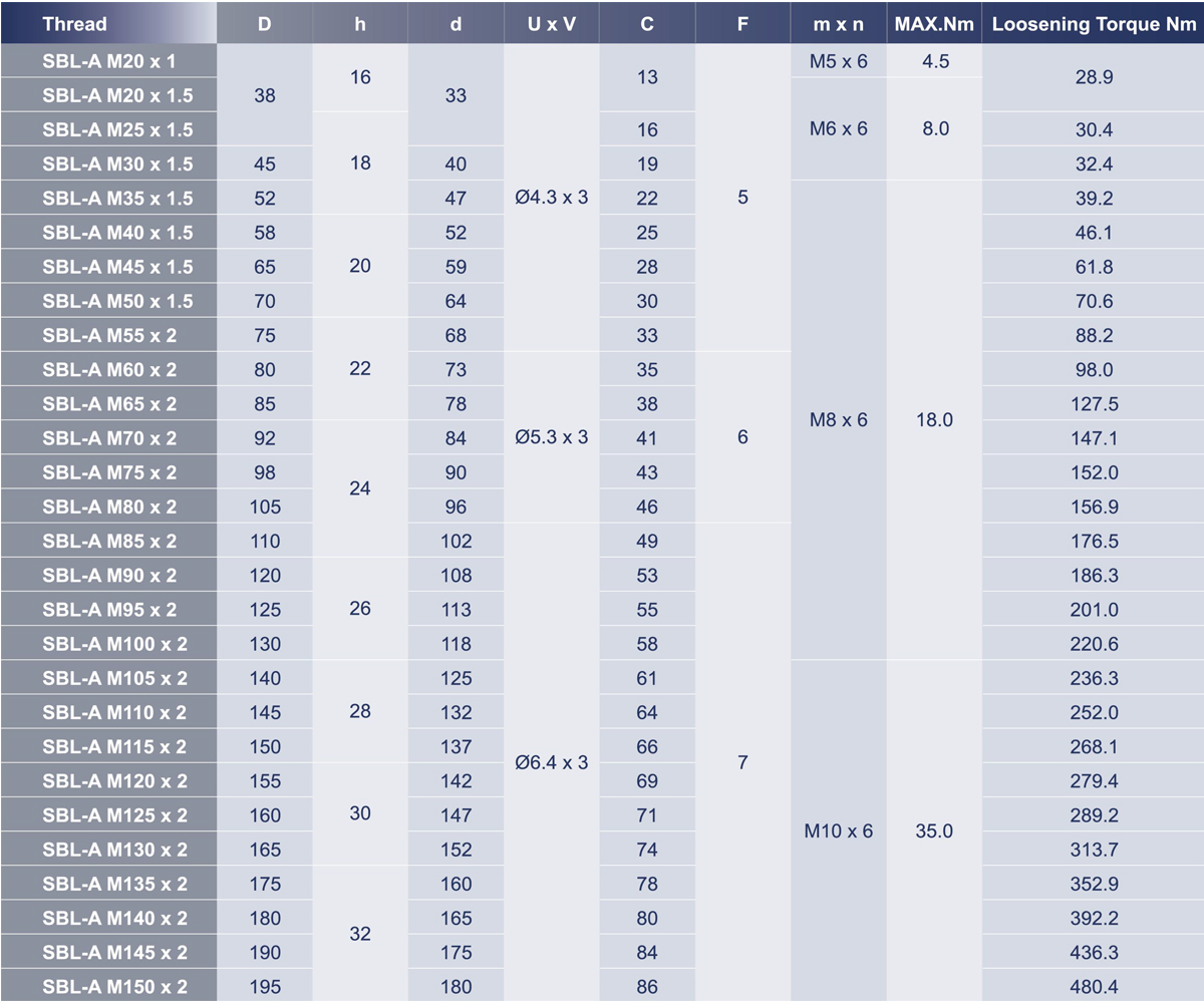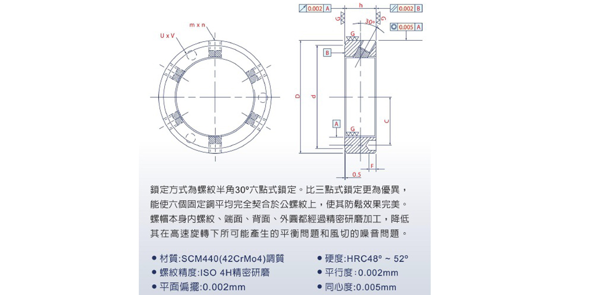 锁紧方式为螺纹半角 30° 六点式锁定。比三点式锁定更为优异,能使六个固定铜平均完全契合于公螺纹上,使其防松效果更完美。螺帽本身内螺纹、端面、背面、外圆都经过精密研磨加工,降低其在高速旋转下所可能产生的平衡问题和风切的噪音问题。
