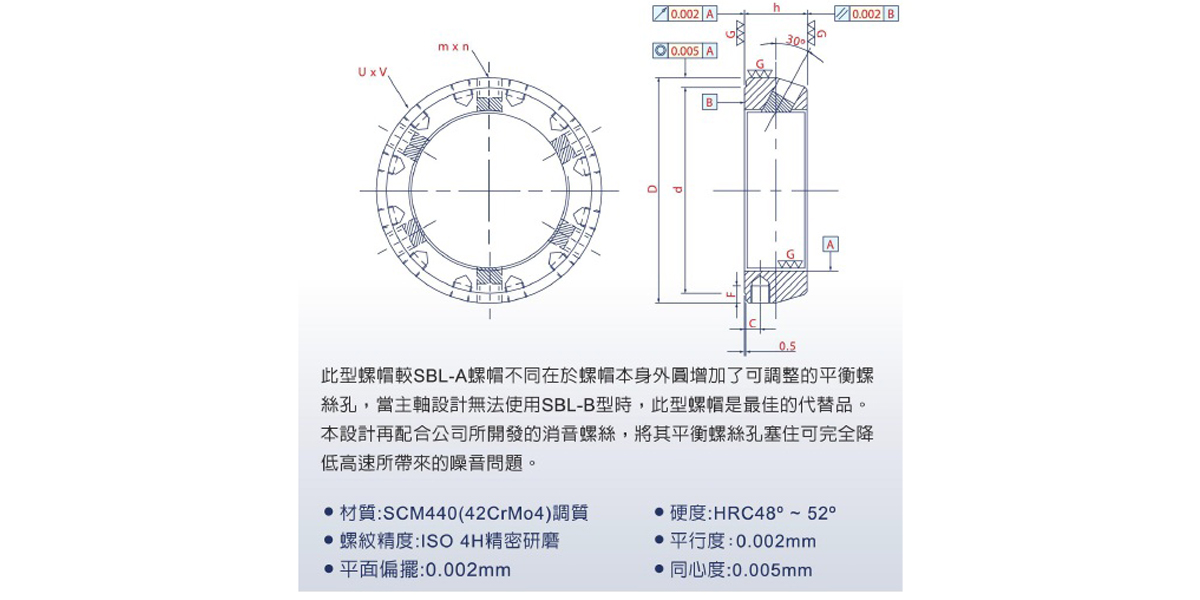 此型螺帽较 SBL-A螺帽不同在于螺帽本身外圆增加了可调整的平衡螺丝孔,当主轴设计无法使用 SBL-B型时,此型螺帽是最佳的代替品。本设计再配合公司所开发的消音螺丝将其平衡螺丝孔塞住,可完全降低高速所带来的噪音问题。