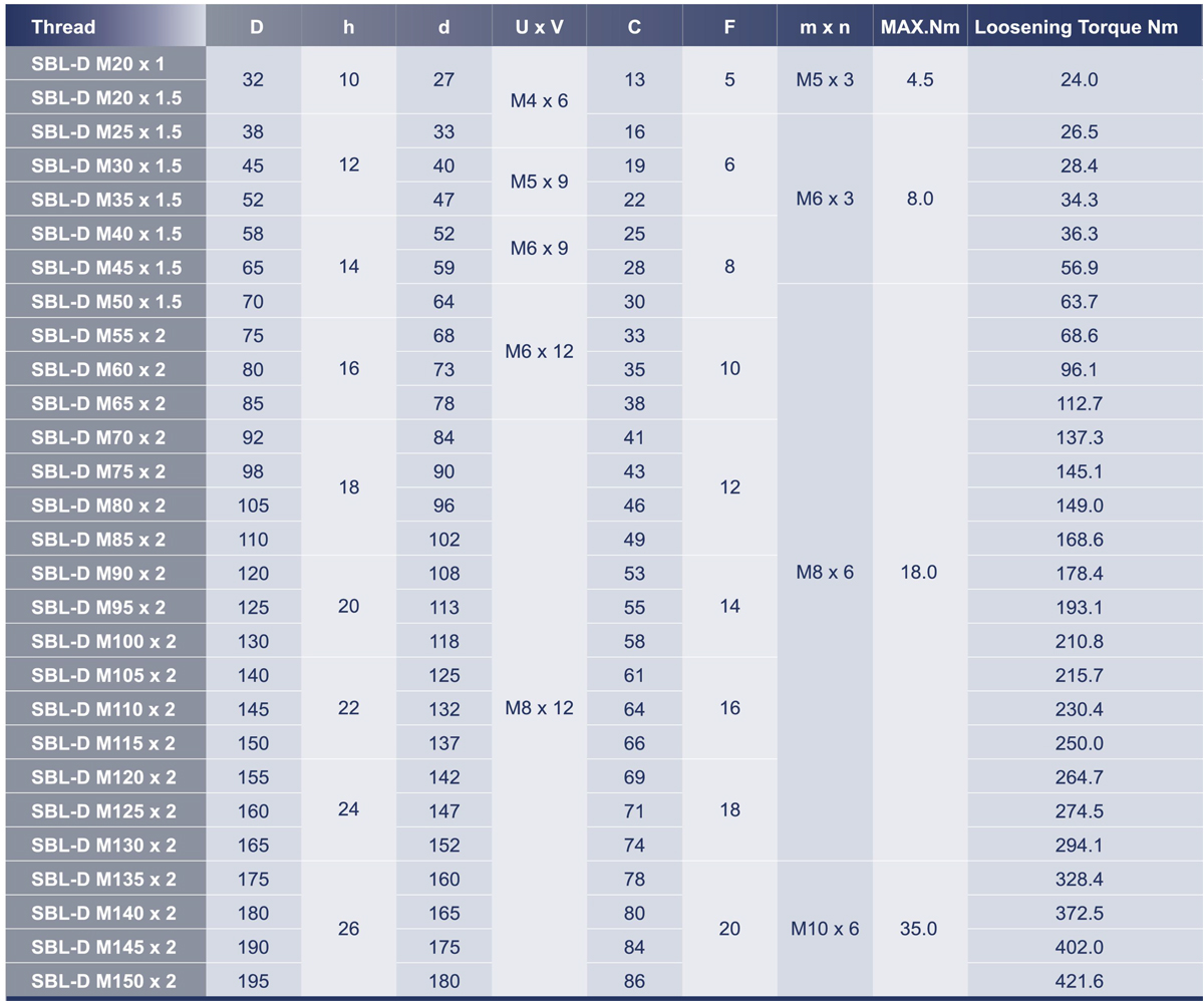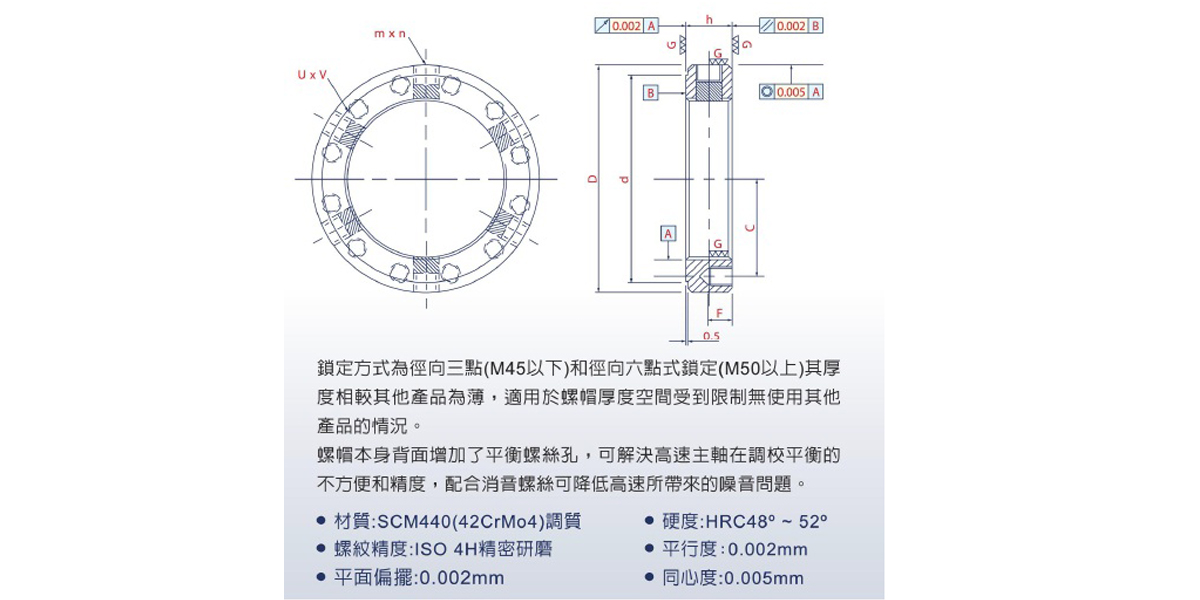 锁定方式为径向三点(M45以下)和径向六点式锁定(M50以上)其厚度相较其他产品为薄,适用于螺帽厚度空间受到限制无使用其他产品的情况。 螺帽本身背面增加了平衡螺丝孔,可解决高速主轴在调校平衡的不方便和精度,配合消音螺丝可降低高速所带来的噪音问题。