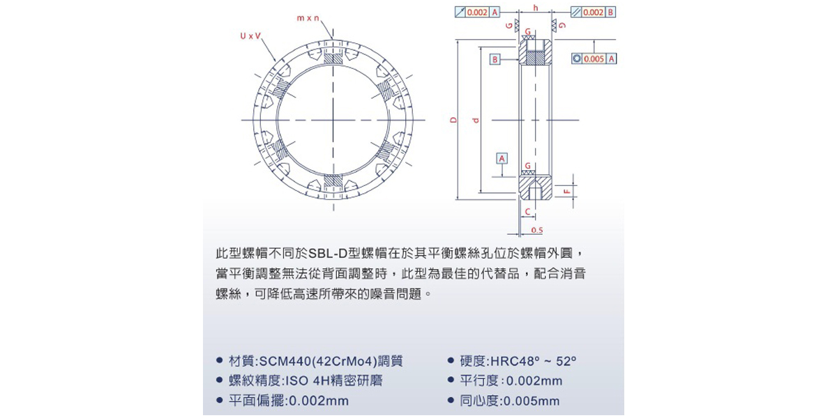 此型螺帽不同于SBL-D型螺帽在于其平衡螺丝孔位于螺帽外圆,当平衡调整无法从背面调整时,此型为最佳的代替品,配合消音螺丝,可降低高速所带来的噪音问题。