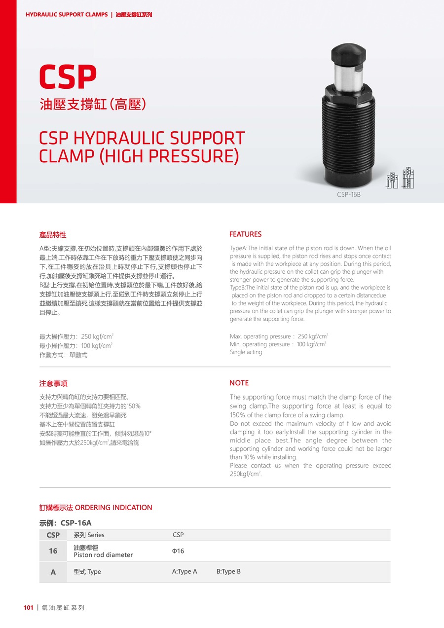 A 型: 夹缩支撑,在初始位置时,支撑头在内部弹簧的作用下处于最上端,工作时依靠工件在下放时的重力下压支撑头使之同步向下,在工件稳妥的放在治具上时就停止下行,支撑头也停止下行,加油压后支撑缸锁死给工件提供支撑并停止运行。