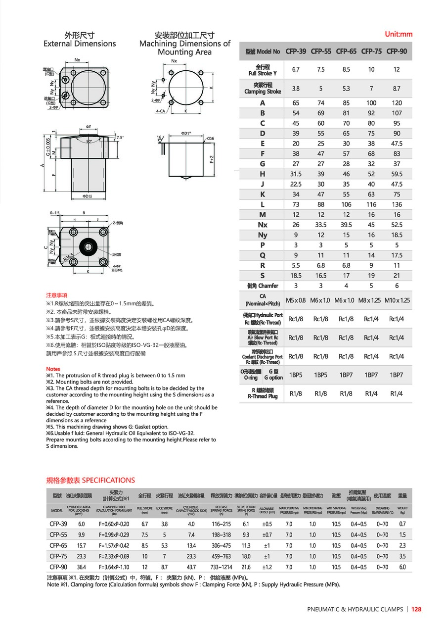 | 油缸夹紧侧面积(cm²) | 6 | 9.9 | 15.7 | 23.3 | 36.4 |