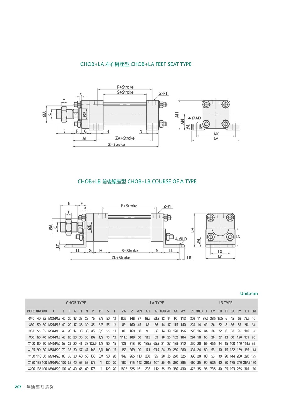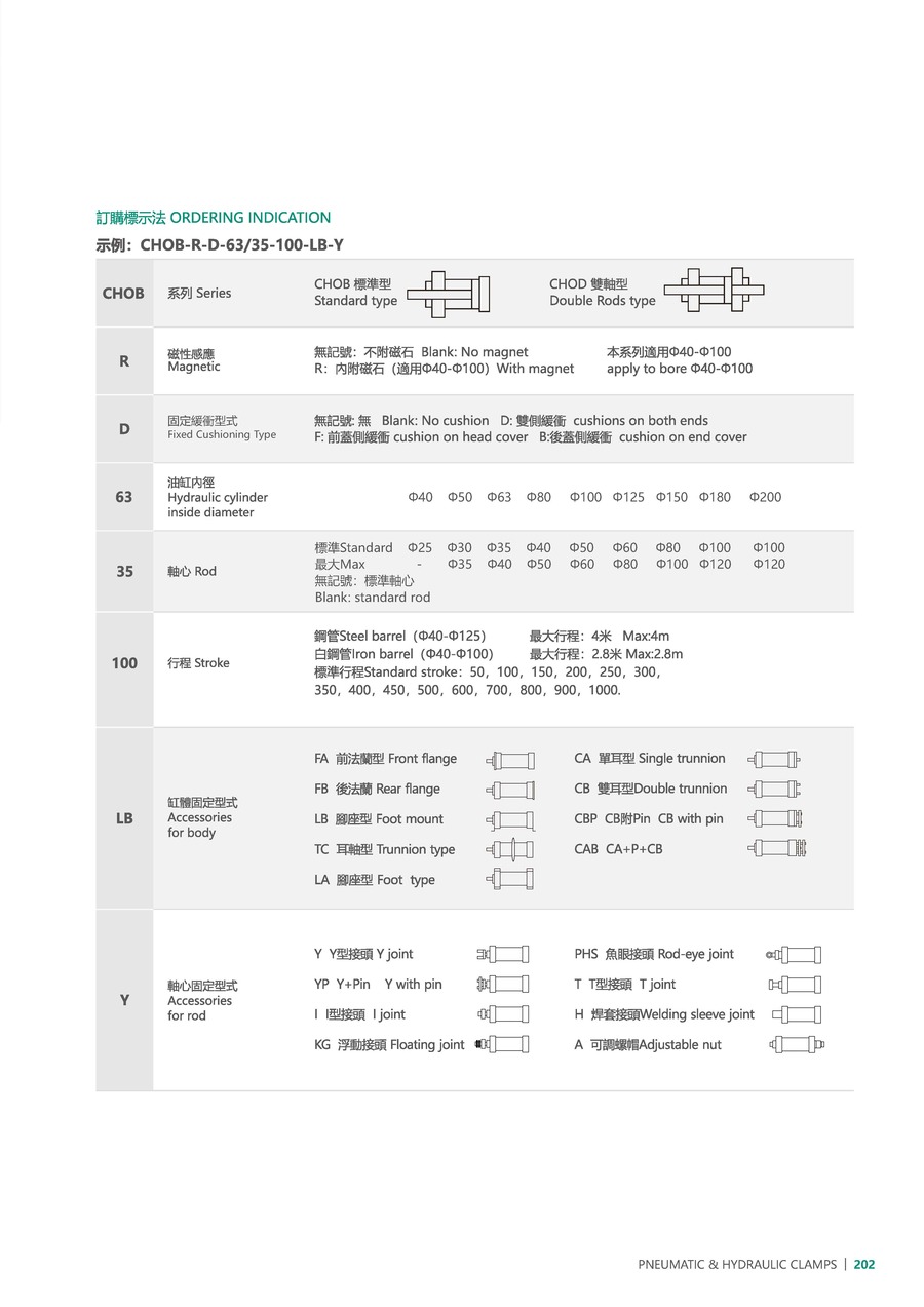 | LB | 缸体固定型式 | FA: 前法兰型, FB: 后法兰, LB: 脚座型, TC: 耳轴型, LA: 脚座型, CA: 单耳型, CB: 双耳型, CBP: CB+Pin, CAB: CA+P+CB |