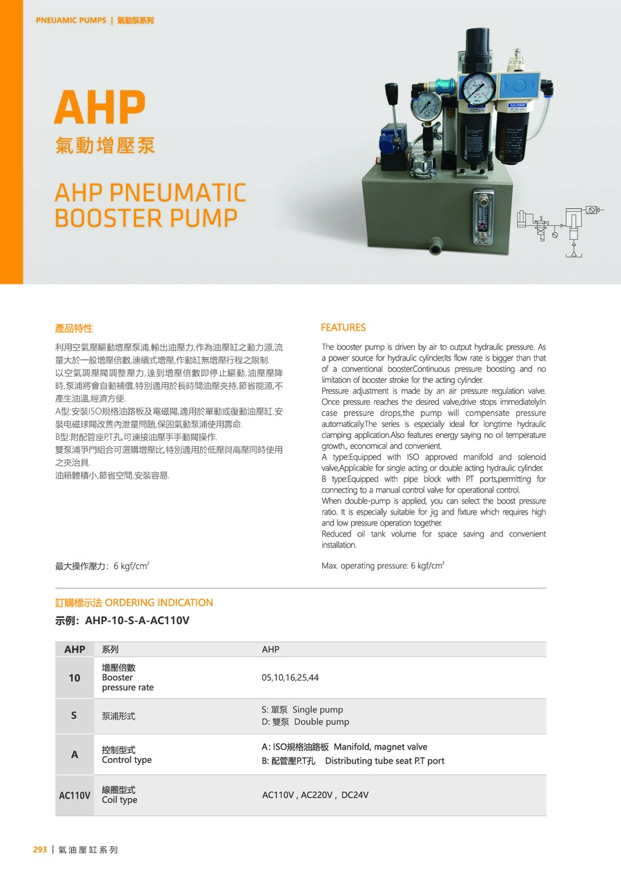利用空气压驱动增压泵浦,输出油压力,作为油压缸之动力源,流量大于一般增压倍数,连续式增压,作动缸无增压行程之限制。