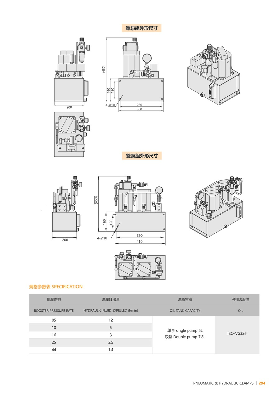 附配管座P.T孔,可连接油压手手动阀操作,双泵浦争门组合可选购增压比,特别适用于低压与高压同时使用之夹治具,油箱体积小,节省空间,安装容易。